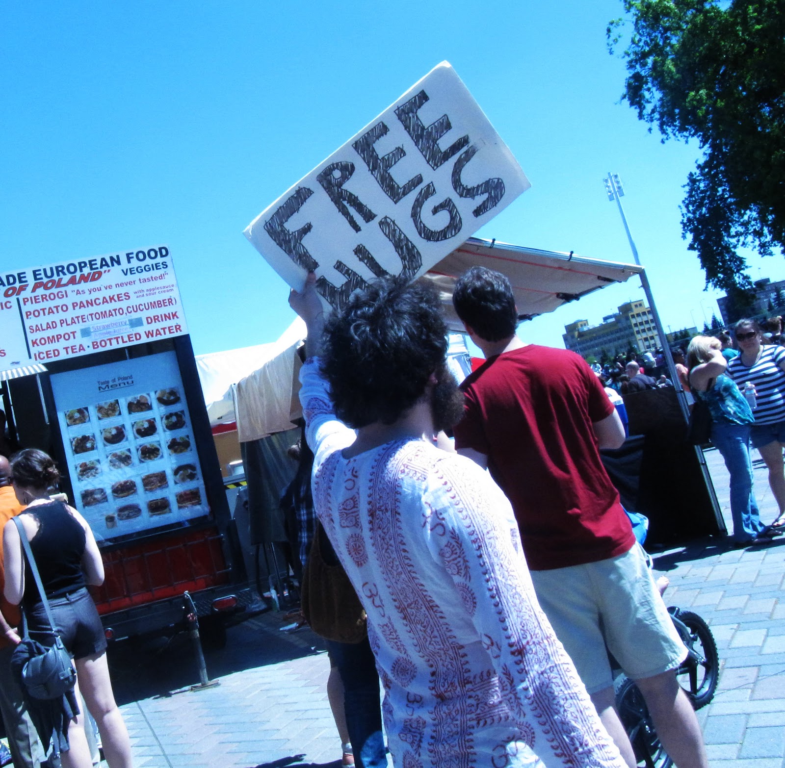 A rock placed beside the tip jar of a food kart at the Saturday Market